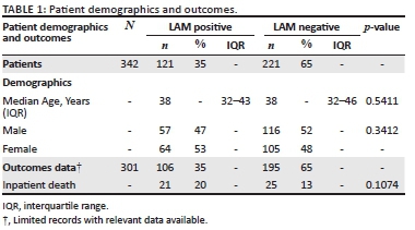 Regarding the patient outcomes (Table 1), data were available for 301 patients (88%), of whom 46 (15%) died. Higher mortality (not meeting statistical significance) was noted in the LAM+ve group (20% vs 13%, P = 0.107). All patients diagnosed with TB were initiated onto treatment in hospital.