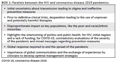 When the novel coronavirus emerged in late 2019, much was unknown about its transmission, treatment and trajectory. In response to the rapidly growing case numbers and global spread, the World Health Organization declared the coronavirus disease 2019 (COVID-19) outbreak a public health emergency of international concern on 30 January 2020.1 At the time, there was widespread uncertainty and fear about the mode of spread of severe acute respiratory syndrome coronavirus 2 (SARS-CoV-2), leading to hysteria and responses such as washing down groceries and other measures that were ultimately discarded. Early on, there were no known treatments for COVID-19, and in many places around the world, medications that ultimately proved ineffective - like hydroxychloroquine - were frequently administered out of desperation.2,3 In addition, it soon became clear that COVID-19 was disproportionately affecting key populations such as racial and ethnic minorities in the United States (US) and other countries and the poor all around the world. In many ways, these early responses to COVID-19 were eerily reminiscent of the world's first tentative responses to HIV/AIDS (Box 1).
