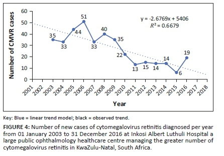 The number of new cases of CMVR each year was determined using the date of diagnosis, from which a trend analysis was made (Figure 4) for the period 01 January 2003 to 31 December 2016. Data collected in 2002 and 2017 were incomplete and, therefore, not included. Fitting a linear trend model (Figure 4 - blue dotted line) resulted in a coefficient of determination (R2) of 0.67. This indicated that there was an overall linear decrease in the number of new CMVR cases per year. With regard to the observed trend (Figure 4 - blue solid line), there was a 1.5× (fold) increase in the number of new cases per year between 2003 and 2006 followed by a 3.9× (fold) decrease in cases between 2006 and 2011. Thereafter, the number of new cases of CMVR diagnosed annually failed to progressively decrease with time. Notwithstanding the fact that the years 2002 and 2017 were not available, the model indicates the expected trend for the study period 2002 (36) and 2017 (6).