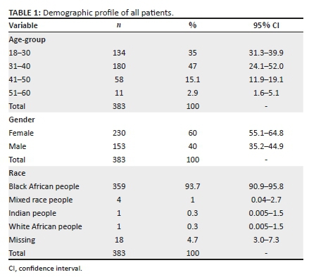 In this study, the age range of patients was 18-69 years, with 230 (60.1%) being female and 153 (39.9%) male participants. The median age was 33.00 years (IQR: 29-38), and based on the Kolmogorov-Smirnov test, the participants' ages were not normally distributed, P = 0.092. The majority of patients were of black African ethnicity, n = 359 (94.0 %).