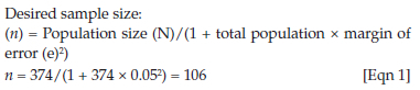 The sampling procedure was conducted to limit error and determine the sample size to assure reliable results. A sample size was computed from the total population of 374 young people aged 18-24 years receiving HIV treatment and care services in the five facilities drawn from Tier.Net. A representative sample size of 106 with a 5% margin of acceptance error was concluded for this study.