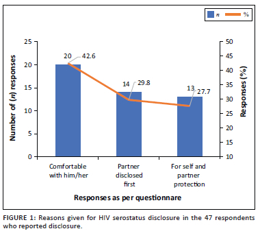 Slightly above half, 50/97 (51.5%), had not disclosed their HIV-positive status to their sexual partners. Gender was associated with HIV status disclosure to sexual partners: 22/32 (68.7%) of the male respondents had never disclosed their HIV status to any of their sexual partners compared to 28/65 (46.1%) of the female respondents (P < 0.01). Reasons for HIV status disclosure are shown in Figure 1. Respondents who reported non-disclosure cited fear of rejection by their partners as the main reason.