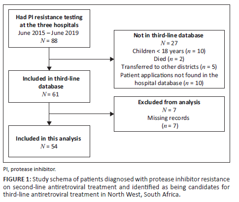 During the study period 88 patients with PI resistance testing were registered at the NHLS in North West and 54 patients were enrolled into the study. Reasons for exclusion are shown in Figure 1.