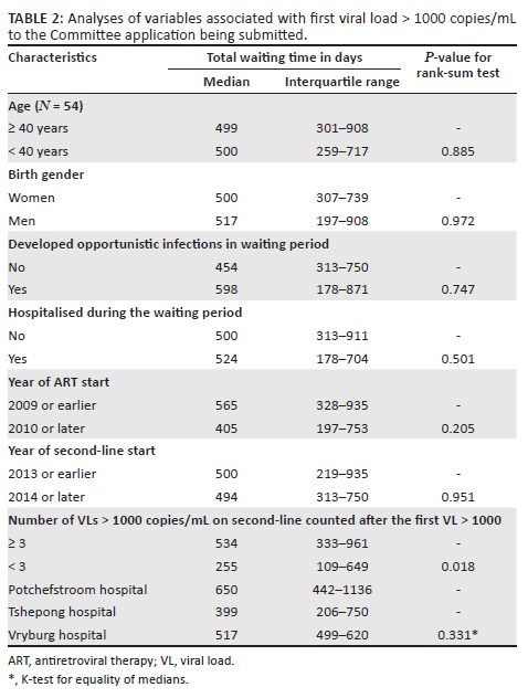 Analyses of categorical variables associated with time to TLART application are shown in Table 2. The total waiting time in days was analysed looking at the patient characteristics and the number of viral loads done during that period was statistically significant.