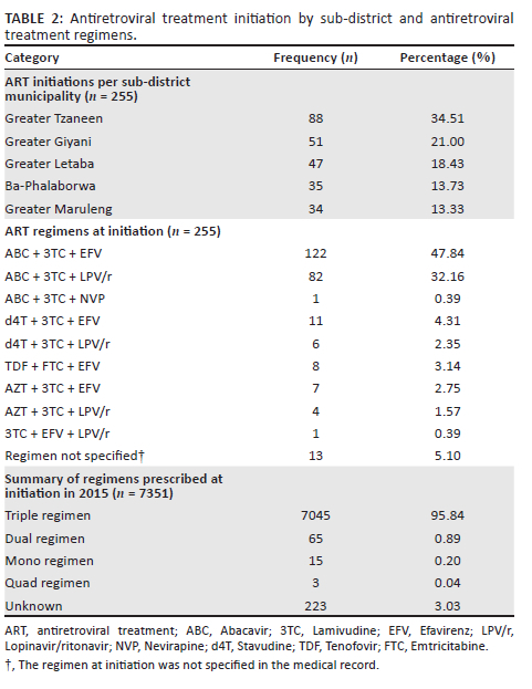 Table 2 gives an overview of the ART regimens the children were initiated on per sub-district. Most children (78%) were initiated on an Abacavir-containing regimen, as recommended by the 2015 South African HIV/AIDS guidelines, but 7% of children were initiated on Stavudine-containing regimens.