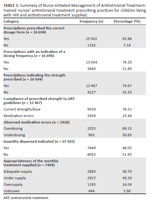 To our knowledge, there is currently limited published research and evaluations of antiretroviral prescribing practices in children under 15 years initiated and managed on ART by NIMART-trained professional nurses in resource-limited rural PHC facilities. This study aimed to evaluate the appropriateness of antiretroviral use and describe the compliance of NIMART-trained nurses with HIV and/or AIDS treatment guidelines.
