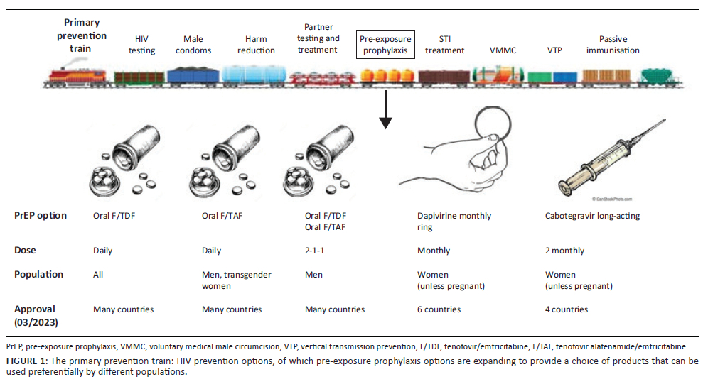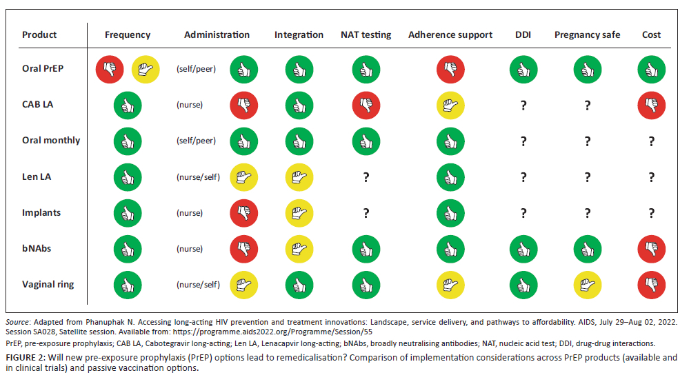 The number of products that can provide pre-exposure prophylaxis (PrEP) for HIV prevention is expanding, with three now approved in South Africa (oral Tenofovir-based PrEP, injectable Cabotegravir, and a Dapivirine-based vaginal ring) and more in the development pipeline. Although highly effective and safe, oral PrEP products have not reduced HIV incidence in South Africa to the extent seen in other countries, primarily due to adherence challenges, rapidly diminishing persistence over time, and insufficient scale-up of PrEP service delivery. The Dapivirine vaginal ring, which provides 1-month-long protection, provides women with a new and discreet choice for PrEP; however, it is Cabotegravir long-acting (CAB LA) that is anticipated to land the largest impact. Administered as an intramuscular injection given every 2 months, CAB LA is safe, highly efficacious, and expected to become available in South Africa in late 2023. Yet, clinical and implementation questions remain, including the need to understand and characterise breakthrough HIV infections amongst CAB LA users, knowledge of how to package each PrEP product in a new context of PrEP choice, and how to avoid the remedicalisation of PrEP access following extensive efforts to make oral PrEP delivery differentiated and community based.