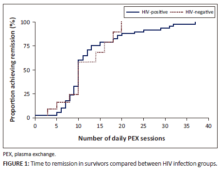 Data were anonymously extracted from clinical case records and stored in an Excel (Microsoft Corp., Redmond, Washington, United States) spreadsheet which was imported into Statistica version 14.0.1 (TIBCO Software, Palo Alto, California, United States) for analysis; Stata version 17 (StataCorp, College Station, Texas, United States) was used to plot remission curves. Estimated GFR (eGFR) was recalculated from presenting serum creatinine using the CKD-EPI formula with the race coefficient removed. Median haemoglobin concentration, platelet count, lactate dehydrogenase (LDH) activity level, creatinine concentration, eGFR at presentation, and the presence of neurological deficit or pyrexia were described for the series as a whole and for HIV infection categories; the Mann-Whitney U and Fisher exact tests were used to compare parameters between categories. The effect of presenting parameters and HIV infection status on the duration of PEX required to induce remission was modelled using Cox regression analysis censored for inpatient death. In-hospital mortality and residual renal dysfunction (defined as an eGFR of less than 60 mL/min per 1.73 m2 on discharge) outcomes were modelled using stepwise multivariate logistic regression analysis.