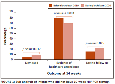 The increase we found in infant mortality and loss to follow-up in the 2020 group of infants that did not have a 10-week HIV PCR suggests that the COVID-19 pandemic and associated lockdown restrictions did have a significant impact on children's access to healthcare. However, in both years, most infants who did not have a 10-week HIV PCR did have evidence of healthcare attendance. This finding is equally important and represents critical missed opportunities - perhaps an argument for integrated packages of care with VTP interventions forming part of other routine child health visits.