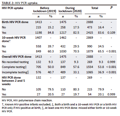 RESULTS: A total of 2888 infants were included: 1474 born in 2020 and 1413 in 2019. Compared to 2019, there was an increase in the 10-week HIV polymerase chain reaction (PCR) uptake in 2020 (71% vs. 60%, P < 0.001). There was also an increase in the proportion of infants who demised without 10-week testing or were lost to follow-up in 2020 compared to 2019 (8% vs. 5%, P = 0.017). Differences detected in birth HIV PCR positivity rates between the two groups (1.1% vs. 0.5%, P = 0.17) did not reach statistical significance; however, a significant increase in vertical transmission of HIV by 10 weeks old was found in the 2020 cohort (1.2% vs. 0.5%. P = 0.046