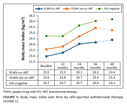 RESULTS: In total, 1518 adult, non-pregnant participants were included, of whom 518 were PLWH on ART (79.8%), 135 PLWH not yet on ART (20.2%) and 865 HIV-negative. HIV-negative participants had significantly higher BMIs than PLWH on ART at all study visits. There was a significant increase in BMI in all subgroups after 36 months (PLWH on ART, BMI +1.2 kg/m2, P < 0.001; PLWH not on ART, BMI +1.8 kg/m2, P < 0.001 and HIV-negative, BMI +1.3 kg/m2, P < 0.001.