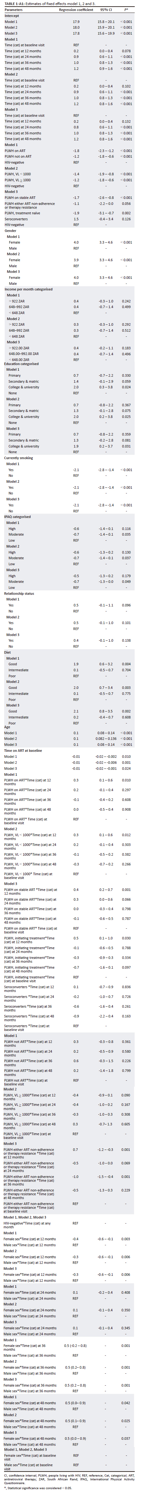 In all three models, we used a random intercept and a random effect for time. The following variables were included as fixed effects: HIV treatment status (as defined per model), sex, age, time, time on ART at baseline, income per month, relationship status, physical activity, educational level, fruit and vegetable intake, smoking status, and the interaction between time and both HIV treatment status and gender. Time on ART at baseline was set to zero for participants not on ART at study enrolment. Known duration of HIV infection was not included in our model, as a high correlation with ART duration was expected. To avoid assumptions of the BMI trend over time, BMI was included as both an ordinal and a continuous variable. Results are presented as estimated marginal means and regression coefficients (β) with 95% confidence intervals.