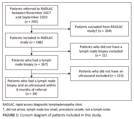 METHOD: This was a retrospective descriptive study of patients attending the peripheral lymph node biopsy clinic at Groote Schuur Hospital between 2017 and 2020, who had abdominal ultrasound examinations while being investigated for unexplained lymphadenopathy. Ultrasound features were compared to the final diagnosis made on the lymph node biopsy.