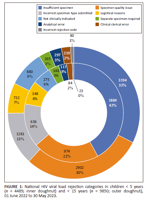 A retrospective descriptive analysis of routine laboratory data from South Africa's public health sector was conducted. Data were extracted from the National Institute for Communicable Diseases (NICD) Data Warehouse in September 2023, for HIV VL specimens registered and rejected within the NHLS from 01 June 2022 to 31 May 2023. Extracted variables included geographical location (province), age (categorised into ≥ 15 years; < 15 years and < 5 years [a subset of < 15 years]), specimen type, and rejection reasons (predefined list on the laboratory information system [LIS]). Rejection rates were calculated using total HIV VL samples registered as the denominator and described for all ages, < 15-year-olds and < 5-year-olds. Rejection reasons, as per the LIS, were further grouped into nine broader categories and described for < 15-year and < 5-year age groups.