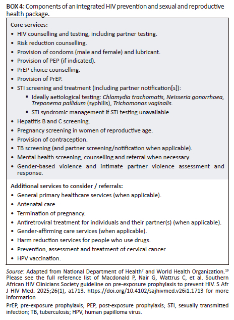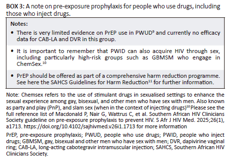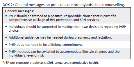 Table 1 details available PrEP options in the South African setting, and Table 2 details appropriate safety screening and monitoring.