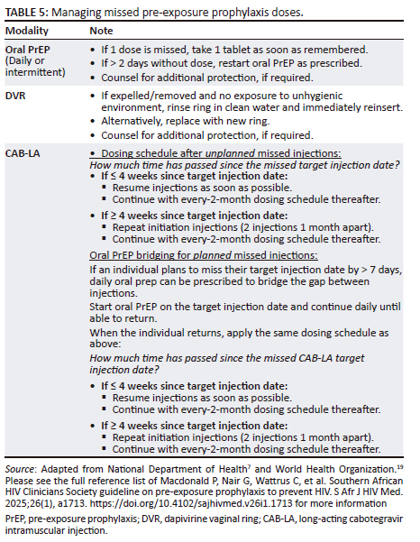 There are many reasons why PrEP users may miss a dose or more, and PrEP providers should be supportive and non-judgemental when this happens. This is often a good time to discuss different PrEP options, choices and the effective use of PrEP, within an integrated HIV prevention and SRH context. Table 5 details how to manage a missed PrEP dose.