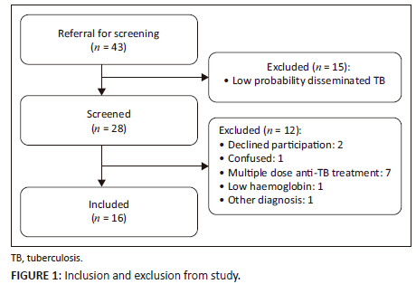Sixteen participants who were either Alere LAM or FujiLAM positive were enrolled in the study (Figure 1). Three participants were lost to follow-up at day 1 (n = 1) and day 7 (n = 2). The median age was 39 years (interquartile range [IQR] 36-43), median CD4 count was 27 cells/mm3 (IQR 8-83), and predominantly male participants (63%) were included in the study. Six (38%) participants reported taking antiretroviral therapy at enrolment. Fifteen (94%) participants had microbiological evidence of TB. There were five in-hospital deaths (31%), with median time to death being 7 days (IQR 2-9). The baseline characteristics are presented in Table 1 and Online Appendix Table 1-A1.