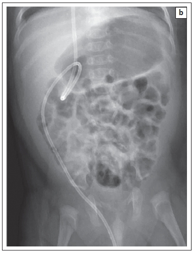a. The NGT is coiled in the oesophageal pouch in a patient with oesophageal atresia and a tracheo-oesophageal fistula. There is an anomalous connection between the umbilical vein and the superior mesenteric vein (SMV). Surgery confirmed the absence of the ligamentum venosum. The UVC deviates to the left and is lying in the SMV. There are also thoracic and sacral vertebral body abnormalities, 13 ribs on the right and 12 on the left. This child also had cardiac, anorectal and radial abnormalities in keeping with a VACTERL association.