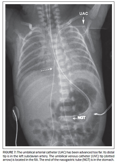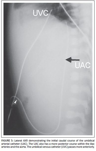 Anomalous positions: Occasionally, the UAC can pass into the femoral or gluteal arteries. It can also pass into a branch of the aortic arch, for instance the common carotid artery or subclavian artery (Figure 6).