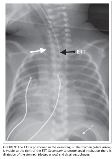 The most common complication is selective intubation of the bronchus (Figure 8a and Figure 8b). This results in collapse/ atelectasis of the contralateral lung. If the patient is on a ventilator, the ipsilateral lung can become hyperinflated, leading to pneumothorax or tension pneumothorax. Another serious complication is inadvertent oesophageal intubation (Figure 9).1 This complication is mostly diagnosed clinically and can be detected radiographically by an air-filled esophagus, over distended stomach and no ETT in the trachea. There are also other complications related to long-term intubation.