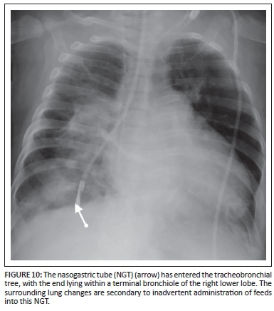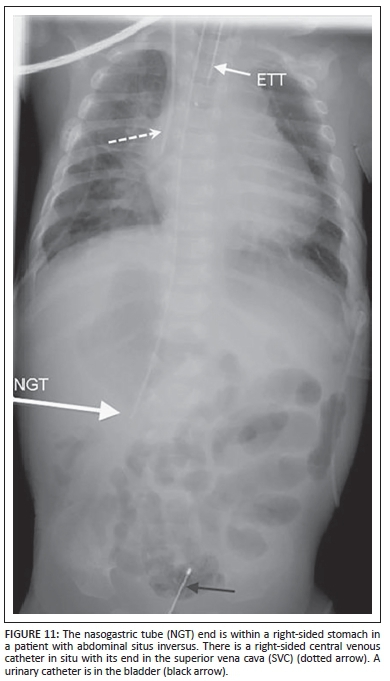 The NGT can be misplaced in the tracheobronchial tree (Figure 10). Perforation of the oesophagus or stomach is extremely uncommon, but can occur, particularly in premature infants.7 A coiled NGT in a proximal oesophageal pouch is important to recognise in oesophageal atresia.2 In neonates with left-sided congenital diaphragmatic hernia, the NGT tip is most commonly positioned at the gastro-oesophageal junction or within the left hemithorax. An NGT deviating to the right is seen in a patient with heterotaxy syndrome and abdominal situs (Figure 11).