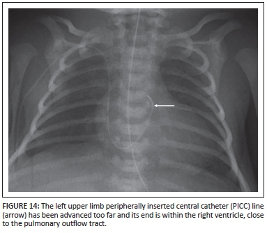 The peripherally inserted central catheter (PICC) is inserted into peripheral limb veins, with the end lying in the distal SVC or at the cavo-atrial junction. Common complications are related to insertion and malpositioning (Figure 14). Correctly positioning it is important for the administration of certain intravenous medications.