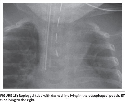 Reploggel suction catheters are used in patients with oesophageal atresia to remove saliva from the blind ending oesophageal pouch. The markings of a Reploggel tube form a dashed line, and help to differentiate it from the ETT (Figure 15).
