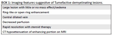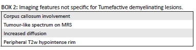 Clinically, TDL may present with features attributable to an intracranial neoplastic mass lesion. MRI is by far the best modality for the assessment of demyelinating lesions of the central nervous system. Generally, TDLs are greater than 2 cm in diameter and exhibit minimal surrounding white matter hyperintensity, oedema or mass effect.2 This is a useful distinguishing feature as neoplastic lesions of this size are known to assert significant mass effect at similar dimensions. The lesions are predominantly located in the supratentorial white matter and favour frontal and parietal lobes, with cortical involvement rarely seen. When identified in the posterior fossa, demyelinating lesions tend to have a predilection for the middle cerebellar peduncles (Boxes 1-2).