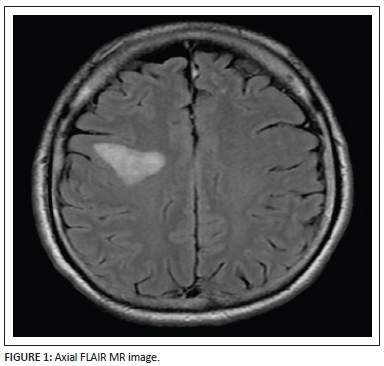 An axial FLAIR (Figure 1) sequence reveals a triangular focus of hyperintensity at the right subrolandic frontal white matter in the centrum semiovale. This lesion, for its size, is not associated with any significant mass effect and there is no disruption of the grey-white matter interface. Incidentally, a few left frontal subcortical hyperintensities are also observed, probably microangiopathic in origin.