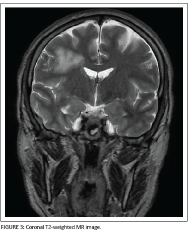 The location of the lesion is well shown on the coronal T2-weighted image (Figure 3) as well as the extent of the lesion from the juxta-ventricular margin up to the subcortical white matter.