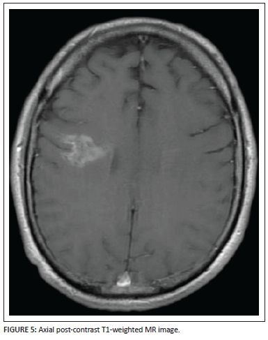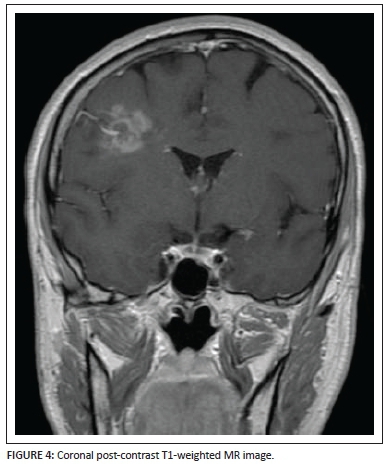 Coronal (Figure 4) and axial (Figure 5) post-gadolinium T1-weighted sequences demonstrate the patchy enhancement of the major portion of the lesion except for the focal areas of necrosis centrally within the lesion bed. The enhancing vessel is well demonstrated, extending from the pial surface through the centre of the lesion. Subtle brush-like vascular enhancement is also seen in the contralateral centrum semiovale white matter.
