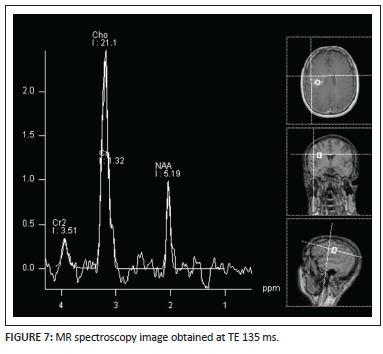 A MR spectroscopy image (Figure 7) performed at TE = 135 ms demonstrates a prominent choline peak with suppression of N-acetyl aspartate (NAA) and presence of a small lactate peak at 1.3ppm. A choline-to-NAA ratio greater than 2:1 is noted. This pattern is non-specific and can be seen in primary or metastatic tumours as well as in tumefactive demyelinating lesions.