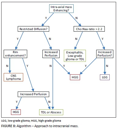 TDLs continue to prove to be a challenge to neurologists, radiologists and neuropathologists. Higher diagnostic accuracy is being reached through the use of advanced MRI techniques in order to obviate unnecessary brain biopsy and in particular to avoid lethal treatment options for erroneously diagnosed neoplasms after biopsy. In combination, imaging features of incomplete rim/ring enhancement, lack of mass effect, absence of cortical involvement and reduced CT attenuation of lesions (relative to grey matter) correlate with a high sensitivity and accuracy for TDL. More specific advanced MRI sequences such as reduced perfusion rCBV values, central vein sign, absence of restricted diffusion and central high NAA/Cr ratio are useful differentiating features. These tools are vital in the radiologists' armamentarium as shown in the algorithm (Figure 8) aiding the approach to an intracranial tumefactive lesion.9