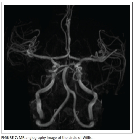 Magnetic resonance angiogram (MRA) was performed to ensure that the circle of Willis (Figure 7) was intact with no evidence of vasculopathy, particularly childhood vasculitis or transient cerebral arteriopathy. The MRA was normal, and importantly no aneurysms were noted.