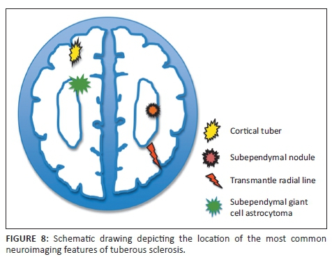 The neurocognitive morbidity associated with TS accounts for the clinical presentation in a large number of patients. Approximately 90% of patients present with seizures. Autism spectrum disorder and intellectual disability are the other frequent neurological sequelae of TS. Table 2 describes the clinical syndromes associated with neurological manifestations of TS including three of which are major criteria for the diagnosis. These lesions have been extrapolated to the schematic drawing in Figure 8.