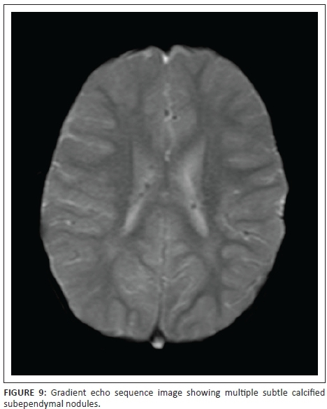 Subependymal nodules (SENS) are also hamartomatous in nature with a large proportion showing early calcification. These lesions are easily demonstrated on non-contrast CT scans or susceptibility-weighted imaging (SWI) or gradient echo sequences. See Figure 9, subtly showing the calcified SENS on a gradient echo sequence and Figure 10 demonstrating many more well-delineated calcified SENS in the patient reported here. Subependymal giant cell tumours or astrocytomas (SEGAS) are typically larger than SENS and occur particularly at the foramen of monro or the caudothalamic groove region. These are WHO Grade 1 tumours with slow progression, lack of local invasion, absence of surrounding oedema or cerebrospinal fluid (CSF) tumour seeding. mTOR pathway inhibitor Everolimus is an approved therapeutic agent for non-surgical management SEGAS.