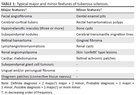 The classically described Vogt triad, comprising adenoma sebaceum/skin lesions, seizures and mental retardation is only encountered in a third of patients. Radiological investigations demonstrate valuable supplementary features, particularly intracranial manifestations, that aid in making a diagnosis.Table 1 outlines the major and minor features encountered in TS.2