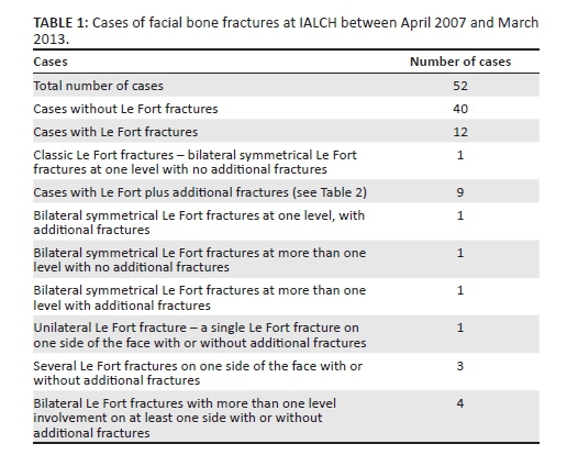Le Fort's classification is today one of the most widely used and understood classifications. In modern clinical practice, however, patients treated at a quaternary-level referral institution, such as Inkosi Albert Luthuli Central Hospital (IALCH), present following mainly high-velocity trauma, which commonly follows motor vehicle collisions. This circumstance is in contrast to Le Fort's work, which was based on low-velocity trauma.