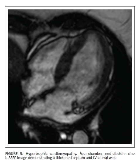 CMR is a unique non-invasive tool and currently integral part of cardiomyopathy work-up. Tissue characterisation remains its major strength, detecting fat, oedema, fibrosis, infiltration and infarction. Its excellent spatial resolution allows accurate evaluation of biventricular function and morphology. It is predicted that most patients with HF will eventually undergo CMR as part of diagnostic work-up and risk stratification.35 Its utility in the South African context is limited by the cost and availability of imaging expertise.