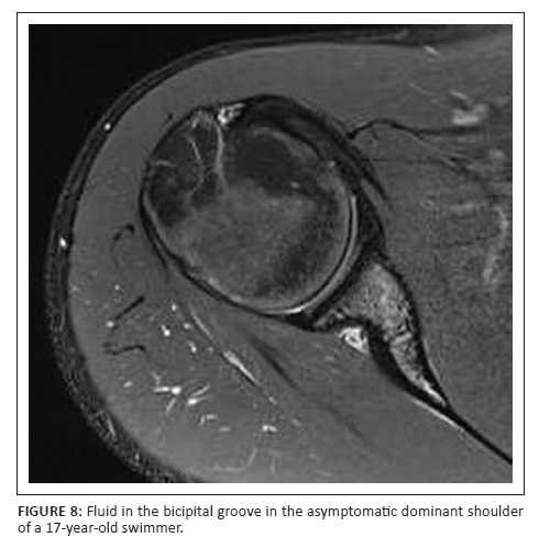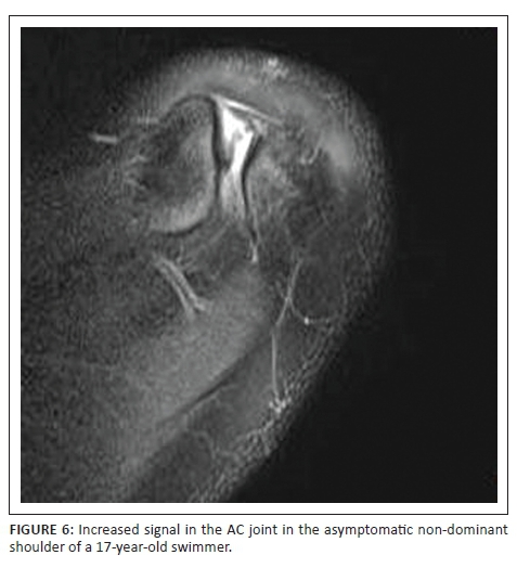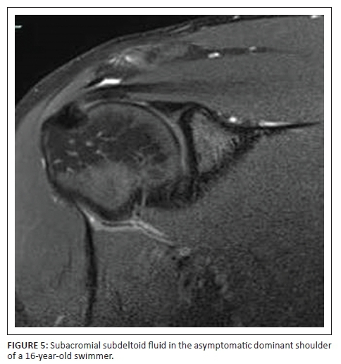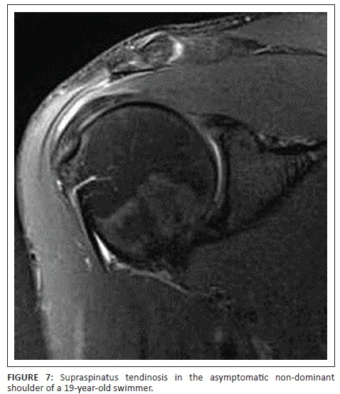 We examined elite swimmers clinically and with bilateral shoulder MRI. Most of these young elite swimmers aspire to compete at the senior international level. They spend on average 13.5 hours a week in the pool and swim an average of 40 km/week. The emphasis of the study was on differentiating clinically insignificant MRI findings in elite athletes from those that are clinically and radiologically significant (Figure 4). It is paramount to provide a baseline of what might be considered clinically irrelevant signal changes and findings in this population, in order to reduce further morbidity by limiting over-diagnosis and preventing unnecessary surgical interventions. Miniaci et al. advocated baseline shoulder MRI for all baseball pitchers owing to the difficulty in interpreting signal changes in these athletes.7