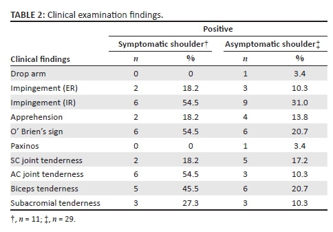 Of the 40 shoulders examined, the most common positive findings were: a positive impingement sign in internal rotation elicited with the Hawkins-Kennedy test (n = 15; 37.5%), positive O' Brien's sign (n = 12; 30.0%), biceps tenderness (n = 11; 27.5%), as well as AC joint tenderness (n = 9; 22.5%). Sternoclavicular tenderness (18.2% vs. 17.2%) was slightly more common in the symptomatic group.