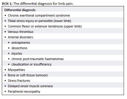 The cornerstone of diagnosis is based on a detailed history, high index of clinical suspicion and careful physical examination. Even in the most astute clinician's hands, the distinction between the different medical causes may be difficult, given the overlap of clinical features. There are several distinct entities that can present with limb pain (listed in Box 1) and these may be clinically indistinguishable from CECS.3