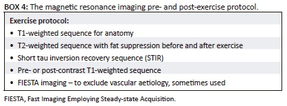 Patients are imaged before and after pain-inducing exercise with contrast, if not contraindicated.5 The basic sequences utilised are listed in Box 4; however, the protocol may vary at different institutions. The axial and coronal scan planes are used. In most instances, the axial plane is preferred allowing for easier identification, and more accurate and reproducible labelling of the various muscle groups.