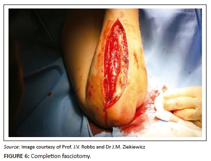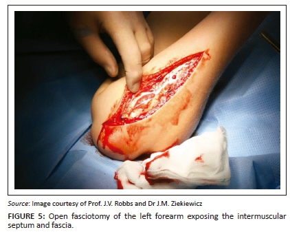 There have been many surgical incisions of the forearm described with most being long and extensile, hence, most incisions can be used to decompress tense forearm compartments. Figure 5 demonstrates open fasciotomy, exposing the intermuscular septum and fascia. Generally, these incisions are left open, hence it is preferred to use one that minimises the exposure of the neurovascular structures and can be extended (if required) to the medial elbow proximally or to the carpal tunnel distally.