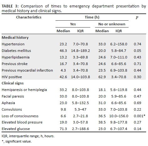 Logistical difficulties in accessing hospital care could also have led to late patient presentation. Although this is not considered to be a significant contributing factor in developed countries, the difference in access to pre-hospital care in our population is different.8 According to Nielsen et al.'s study on the status of pre-hospital care in 13 low- and middle-income countries, including South Africa, large proportions of severely ill and injured people are still not able to receive formal pre-hospital emergency medical care.20 In a prospective stroke study in Nigeria that enrolled 81 patients, no patients were brought to hospital by ambulance.7 Inability to access an ambulance to transport the patient to the hospital could have caused delays in their presentation. The retrospective nature of our study meant that information regarding this piece of the puzzle was unfortunately not available.