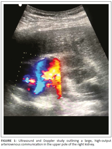 A 63-year-old male patient was referred with lower urinary tract symptoms, who never had haematuria but suffered from episodic right flank pains that he described as pressure like pains. There was no previous history of renal trauma, renal biopsy or renal surgery. Physical examination was unremarkable. Ultrasound study outlined a large, high-output AVM at the upper pole of right kidney (Figure 1). Computed tomography angiography demonstrated enlargement of the right main renal artery, its anterior branch and the upper pole segmental artery of the anterior branch. An arteriovenous fistula was noted between a branch of upper pole segmental artery and a single draining vein. No nidus was seen. Ectasia of the feeding arterial segment and aneurysmal dilatation of the draining vein was seen at the site of the AVM (Figure 2).