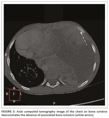 The CT findings depict an ill-defined, large, unilateral, soft-tissue chest wall mass, with heterogeneous enhancement post contrast.2 Low-attenuation regions within the lesion may also be apparent and are representative of haemorrhagic or necrotic areas.2 Associated calcifications are rare, as evident in our case, and have been reported in 10% of the cases.2 Associated rib destruction has been reported in 25% - 63% of the cases.2