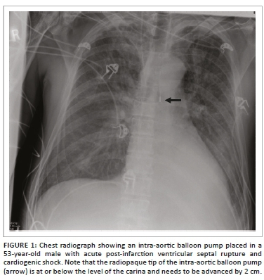 An intra-aortic balloon pump (IABP) is a polyethylene balloon that spans the entire length of the thoracic aorta, placed percutaneously via femoral artery access. The IABP comes in different lengths with IABP selection determined based on the patient's height. The IABP inflates during diastole leading to an increase in blood flow to the coronary arteries, great vessels and renal arteries. Immediately prior to systole, it deflates producing a vacuum effect leading to forward blood flow to the aorta and its branches. Although the IABP is predominately radiolucent on a CXR, it has radiopaque tips proximally and distally. On the CXR, the cephalad radiopaque tip should be 2 cm above the carina (Figure 1). An alternate landmark would be the aorto-pulmonary window. Placing the IABP too caudally may occlude the celiac, superior mesenteric or renal arteries, while placing it too high may occlude the brachiocephalic, subclavian or carotid arteries. Complications that can occur with IABP include vascular (e.g. limb ischaemia, renal insufficiency, mesenteric ischaemia and aortic dissection) and non-vascular (e.g. catheter-related [perforation, tear and incorrect positioning] infection and neurological sequelae).3,4,5