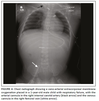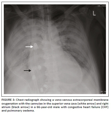 Extracorporeal membrane oxygenation (ECMO) is increasingly being employed in adult patients who fail to wean after cardiopulmonary bypass post-cardiac surgery, as well as in patients with severe respiratory failure. The intention of ECMO is to provide oxygenated blood while extracting carbon dioxide. The two main types of ECMO devices are veno-arterial (VA) ECMO and veno-venous (VV) ECMO. Both allow respiratory support, but only VA ECMO allows haemodynamic support, and hence only the latter is used for HF. In VA ECMO, deoxygenated blood is siphoned off from a vein and oxygenated blood is returned to an arterial vessel (aorta for central VA ECMO and proximal femoral, axillary or subclavian artery for peripheral VA ECMO), while in VV ECMO, the oxygenated blood is returned to a systemic vein or the right atrium. Following appropriate placement, the cannulas are sutured to the skin to prevent displacement and malposition. Radiographs of the chest and abdomen are performed to ensure correct cannula positioning.