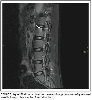 Throughout the literature, South African studies have the largest population-based cases of PSCIs,2,7,8,9 with the most frequent involved region being the thoracic spine, followed by the cervical spine.2,10 Jacobson et al.10 investigated the magnetic resonance imaging (MRI) findings in patients with PSCIs presenting to Groote Schuur Hospital between November 2004 and July 2005.10 Of the 22 patients, five patients (23%) were found to have extradural collections, of which only one had an extra-axial collection with mass effect on the spinal cord; however, because of the patient's complete neurological deficit and associated spinal cord tract, surgical treatment was not deemed necessary. The most prevalent MRI findings in the study by Jacobson et al. were spinal cord signal changes and a perceived wound tract in the spinal cord.